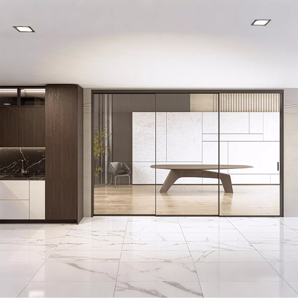 Ate lerragarri oso estuak marko ultra estua + pista diseinu minimalista erabiltzeari egiten dio erreferentzia, 1,5-2 cm-ko ertz oso estuarekin ate lerragarri tradizionalaren sentsazio astuna hausteko, espazioa gardenagoa eta irekiagoa bihurtuz. Apartamentu txiki baten edukiera zabaltzeko edo pisu handi batean luxuzko sentsazioa areagotzeko, funtzioaren eta estetikaren arteko oreka ezin hobea lor dezake "muga ikusezina" moduan.